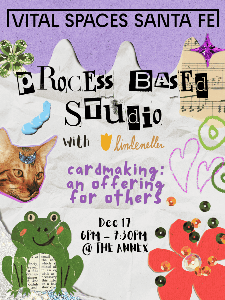 WE SUPPORT ARTISTS BECAUSE ART IS VITAL. Events View More Process Based Studio with Linden Eller! Wednesday, November 19 Gerard’s House Presents Our Journey: Ambiguous Loss and the Art that Expresses It December 19 Winter Mercado Spectacular December 20th 2025 Programs View More Chess Club 1st and 3rd Thursdays Unhoused Art Ongoing Monthly Art Closet Ongoing About Us Learn More Announcements View More News Sign up now! News If you have a story to share, follow this link! Press Ellie Beth Scott’s Exhibition mention in the Reporter! Donate Learn More Spaces View More Vital Spaces Theater Vital Spaces Annex Gallery Studio Artists View More Linda Lomahaftewa David-Alexander Hubbard Sloan Cristina González Sponsors & Partners Sign-Up for Our Newsletter Contact Us
