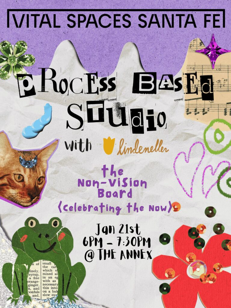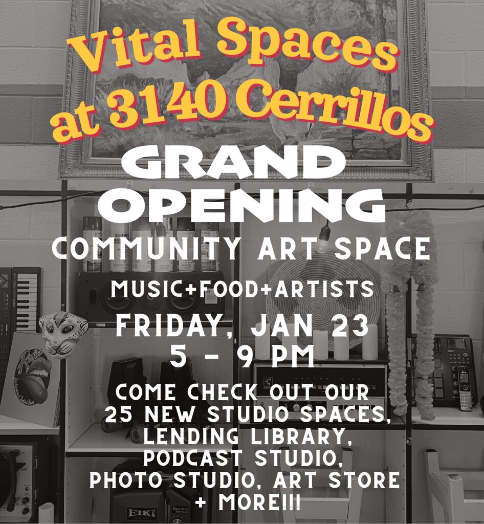 WE SUPPORT ARTISTS BECAUSE ART IS VITAL. Events View More Process Based Studio with Linden Eller! Wednesday, January 21 3140 Cerrillos Grand Opening Friday, January 23 Programs View More Chess Club 1st and 3rd Thursdays Unhoused Art Ongoing Monthly Art Closet Ongoing About Us Learn More Announcements View More News BIG News! Vital Spaces activates former Joannes fabric building / Call for studio artists and work for consignment shop! News Sign up now! News If you have a story to share, follow this link! Donate Learn More Spaces View More Vital Spaces at 3140 Cerrillos Vital Spaces Theater Studio Artists View More Linda Lomahaftewa David-Alexander Hubbard Sloan Cristina González Sponsors & Partners Sign-Up for Our Newsletter Contact Us