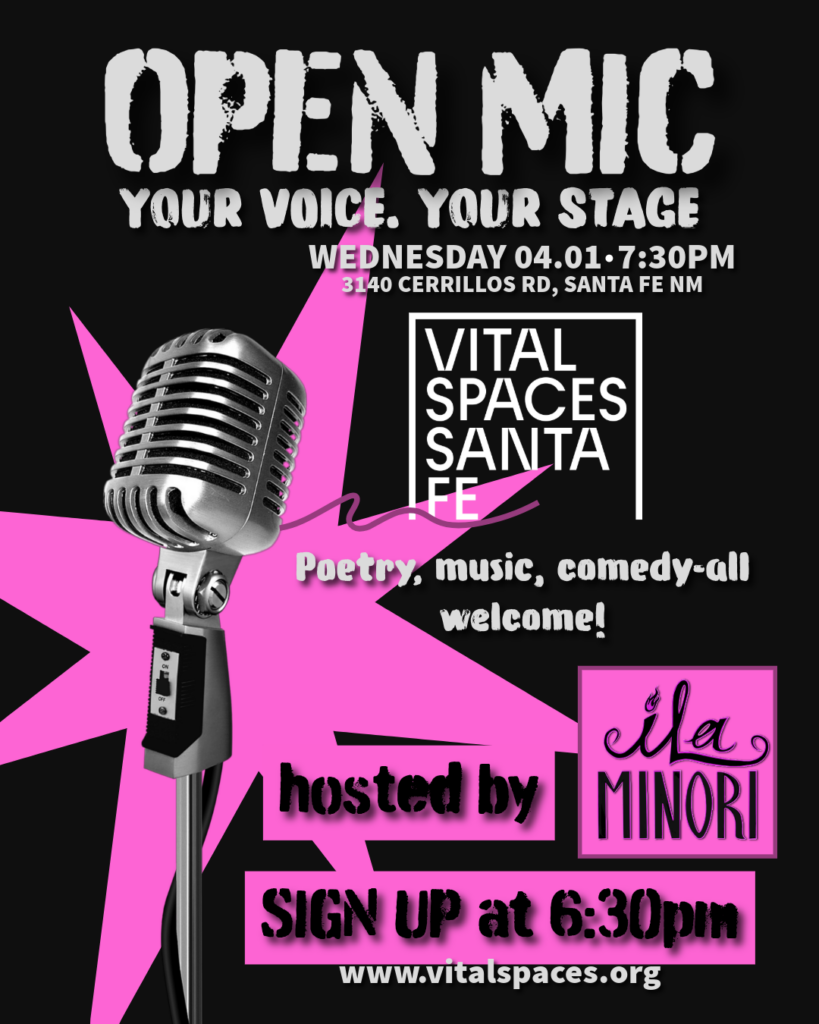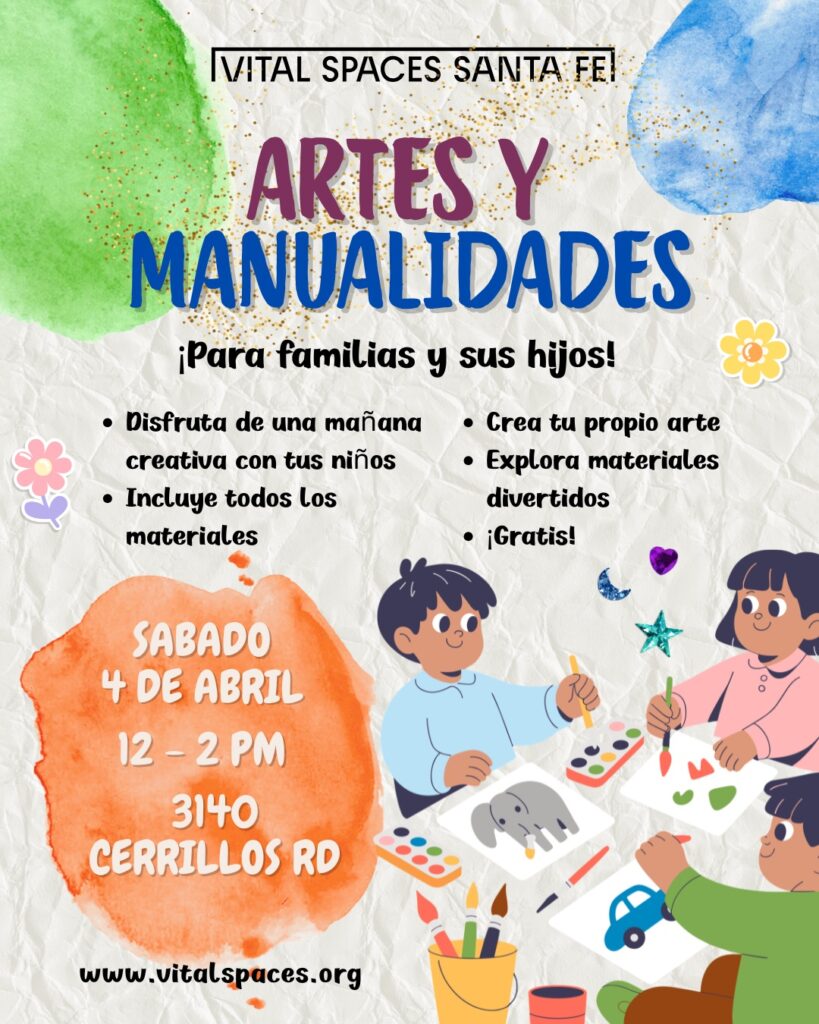 WE SUPPORT ARTISTS BECAUSE ART IS VITAL. Events View More ¡Programas en Español! April Events at Vital Spaces! April 2026 Open Mic Hosted by Ila Minori Wednesday, April 1 Programs View More Creative Social Club at Vital Spaces Vital Spaces Summer Camps June 8 - 12 / June 15 - 20 Monthly Art Closet Every 3rd Saturday About Us Learn More Announcements View More News Why Vital Spaces says No to AI art News BIG News! Vital Spaces activates former Joannes fabric building / Call for studio artists and work for consignment shop! News Sign up now! Donate Learn More Spaces View More Vital Spaces at 3140 Cerrillos Vital Spaces Theater Studio Artists View More Ashley Watkins Carol Schrader Cedar Rose Silverado Sponsors & Partners Sign-Up for Our Newsletter Contact Us