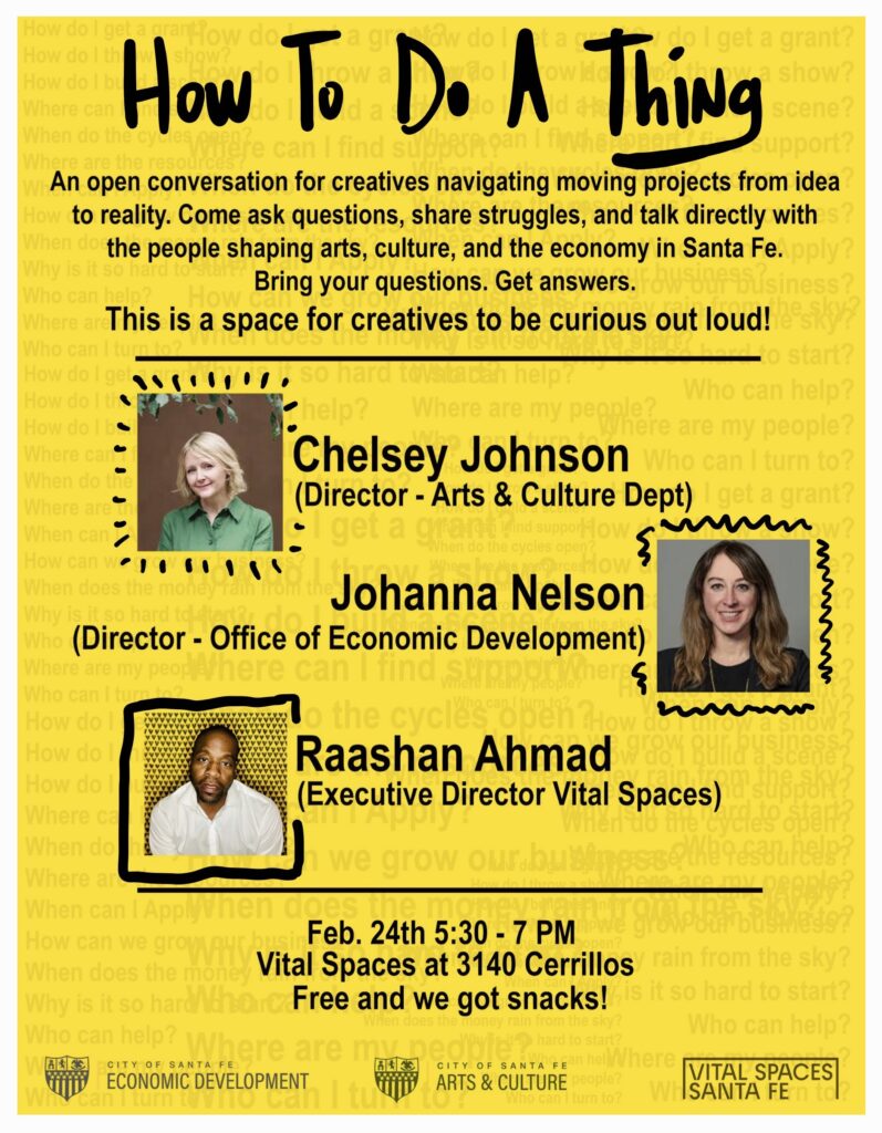 WE SUPPORT ARTISTS BECAUSE ART IS VITAL. Events View More Drawing Social! Sunday, February 22 Monday Beading Circle Monday, February 23 How to Do a Thing Tuesday, February 24 Programs View More Chess Club 1st and 3rd Thursdays Comadres Cada dos miƩrcoles Creative Social Club at Vital Spaces About Us Learn More Announcements View More News Why Vital Spaces says No to AI art News BIG News! Vital Spaces activates former Joannes fabric building / Call for studio artists and work for consignment shop! News Sign up now! Donate Learn More Spaces View More Vital Spaces at 3140 Cerrillos Vital Spaces Theater Studio Artists View More Ashley Watkins Carol Schrader Cedar Rose Silverado Sponsors & Partners Sign-Up for Our Newsletter Contact Us