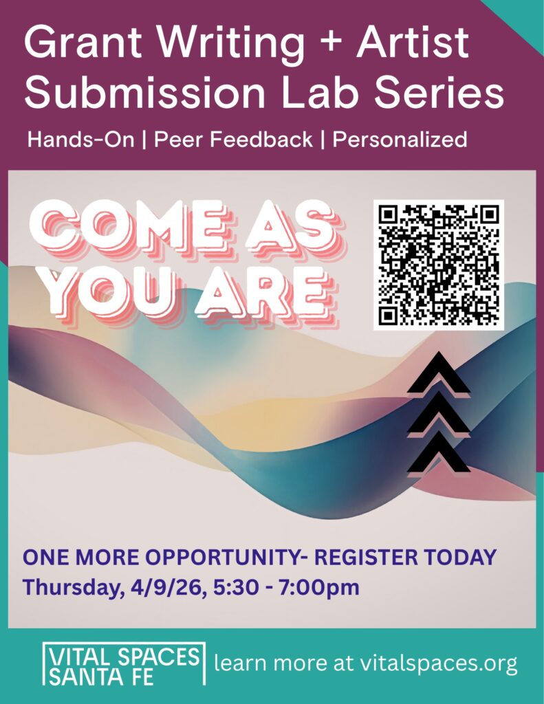 WE SUPPORT ARTISTS BECAUSE ART IS VITAL. Events View More ¡Programas en Español! April Events at Vital Spaces! April 2026 Grant Writing + Artist Submission Lab Thursday, April 9 Programs View More Creative Social Club at Vital Spaces Vital Spaces Summer Camps June 8 - 12 / June 15 - 20 Monthly Art Closet Every 3rd Saturday About Us Learn More Announcements View More News Why Vital Spaces says No to AI art News BIG News! Vital Spaces activates former Joannes fabric building / Call for studio artists and work for consignment shop! News Sign up now! Donate Learn More Spaces View More Vital Spaces at 3140 Cerrillos Vital Spaces Theater Studio Artists View More Ashley Watkins Carol Schrader Cedar Rose Silverado Sponsors & Partners Sign-Up for Our Newsletter Contact Us
