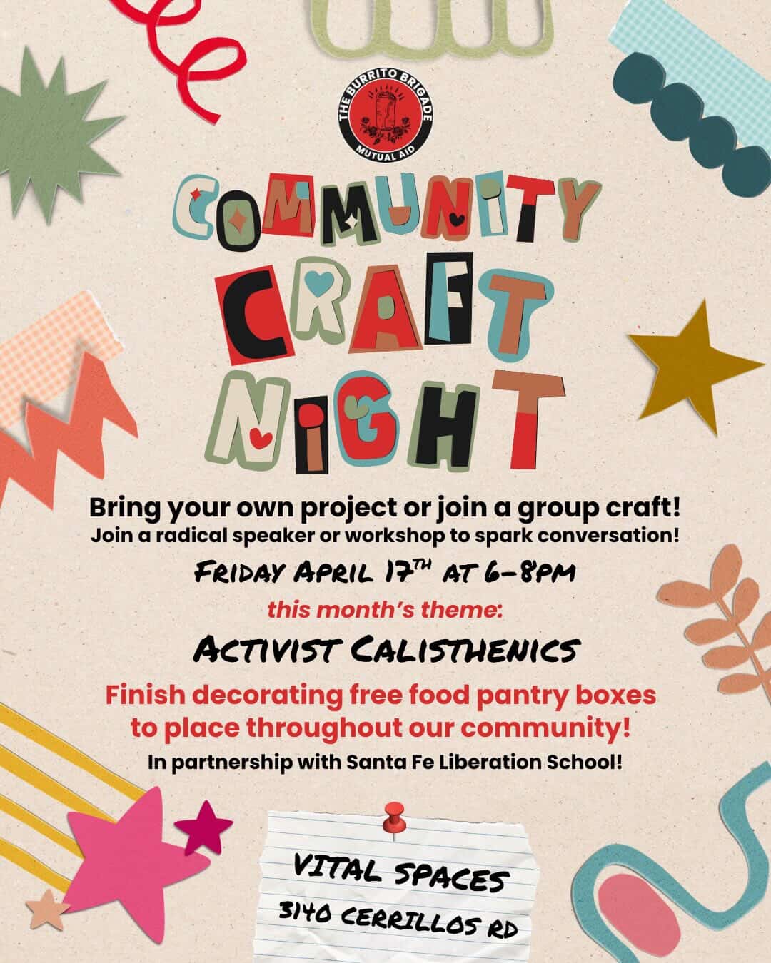 ACTIVIST CALISTHENICS Finish decorating free food pantry boxes to place throughout our community! April 17 | 6 - 8 PM 3140 Cerrillos Rd