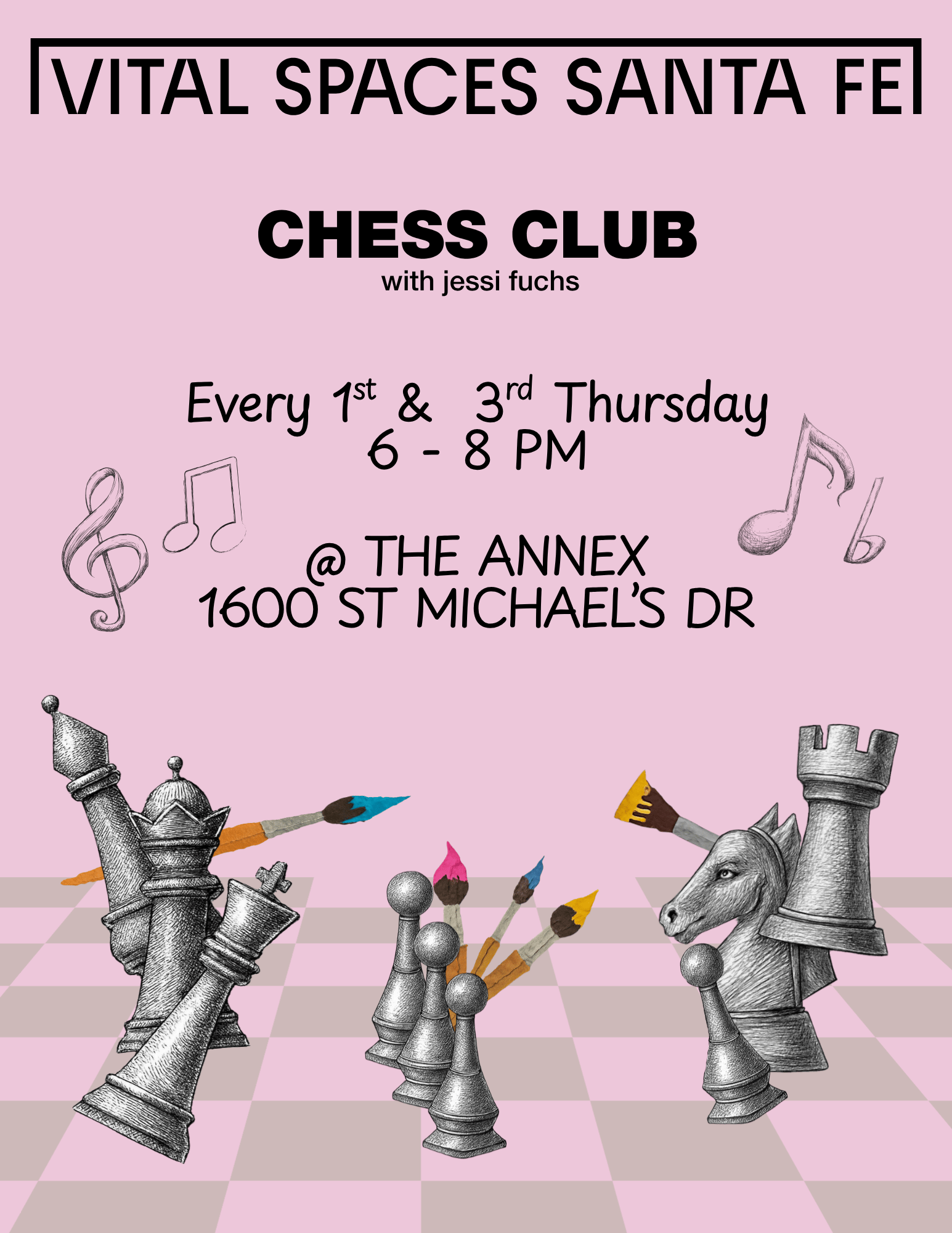 Come out to Chess Club at Vital Spaces! First meeting is November 20th! This is a friendly, casual space for those of all ages and skill levels to learn and practice chess, as well as enjoy live music and create chess- (or other-) inspired art.