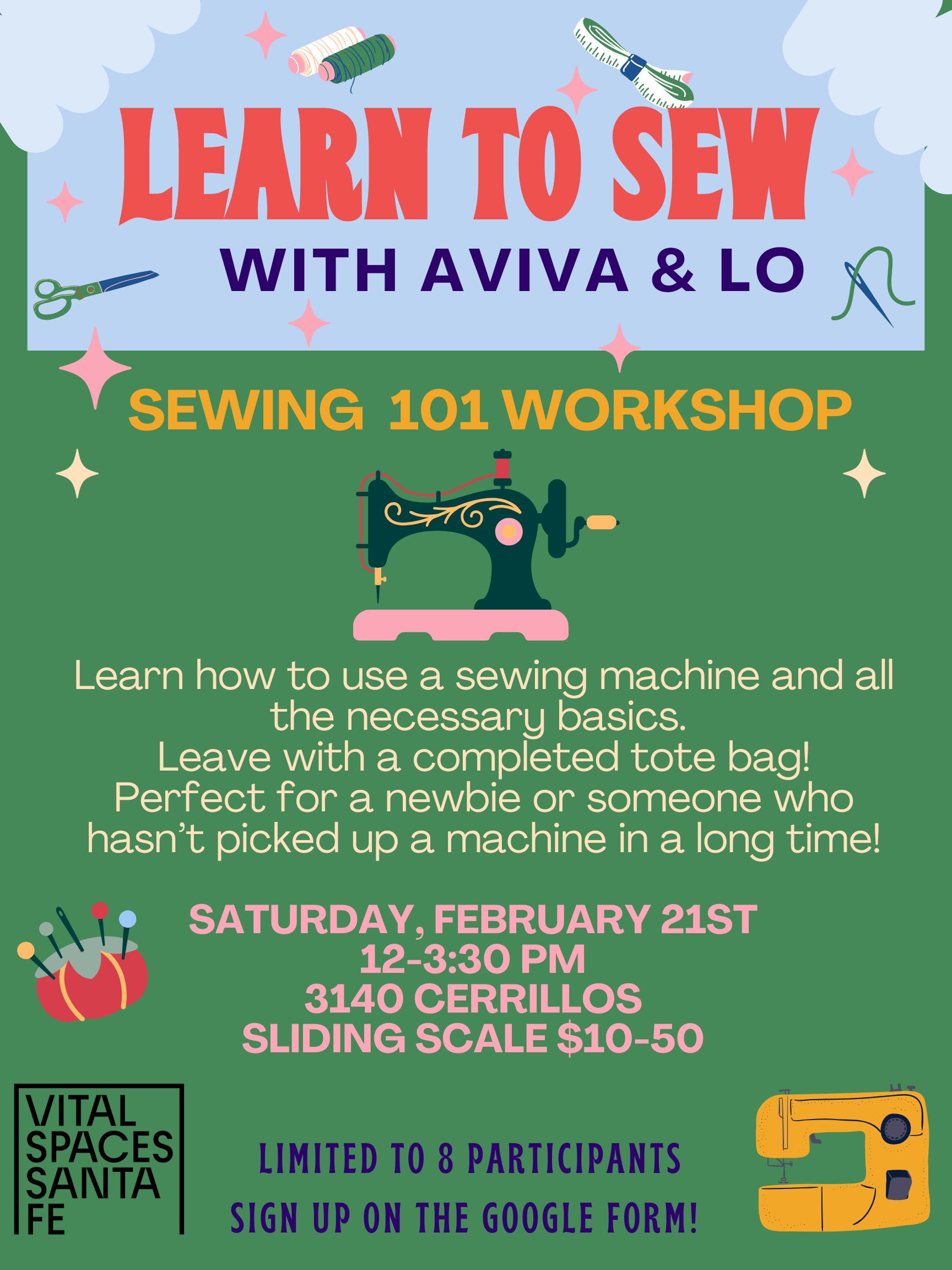 Learn how to use a sewing machine and all the necessary basics. Leave with a completed tote bag! Perfect for a newbie or someone who hasn’t picked up a machine in a long time!