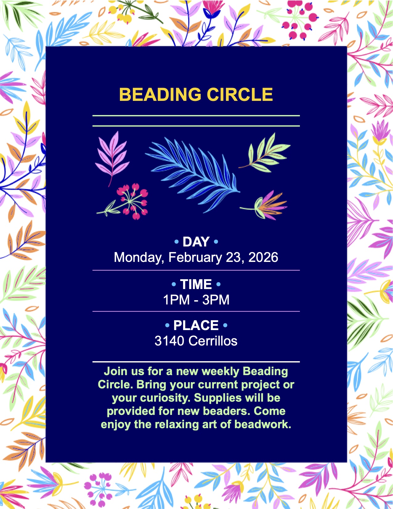 Join Lisa Delmonico’s Beading Circle! Every Monday, 1 – 3 PM. The first meeting will be held on February 23rd.