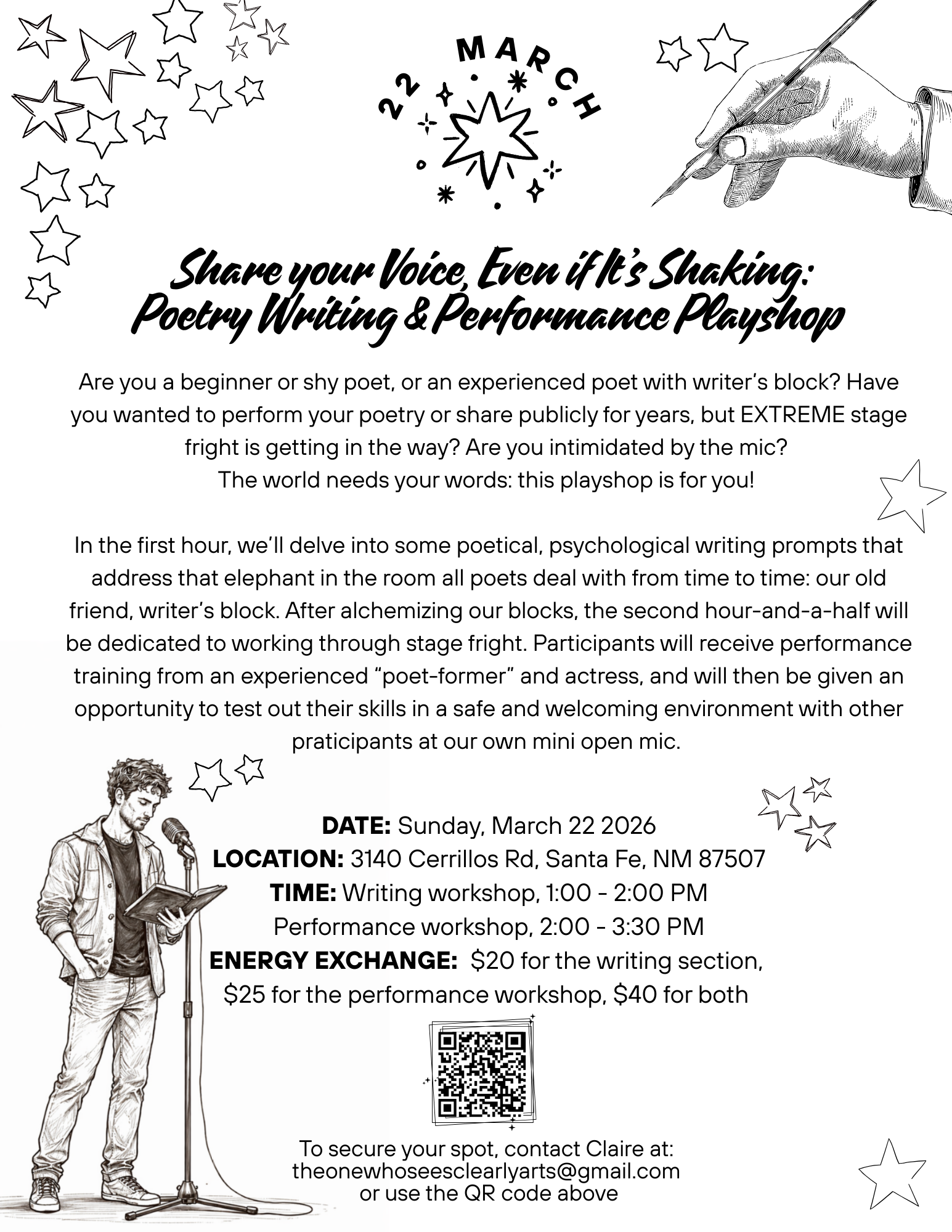 In the first hour, we’ll delve into some poetical, psychological writing prompts that address that elephant in the room all poets deal with from time to time: our old friend, writer’s block. After alchemizing our blocks, the second hour-and-a-half will be dedicated to overcoming stage fright. Participants will receive performance training from an experienced poet-former and actress, and will then be given an opportunity to test out their skills in a safe and welcoming environment at our own “open mic, with training wheels”.